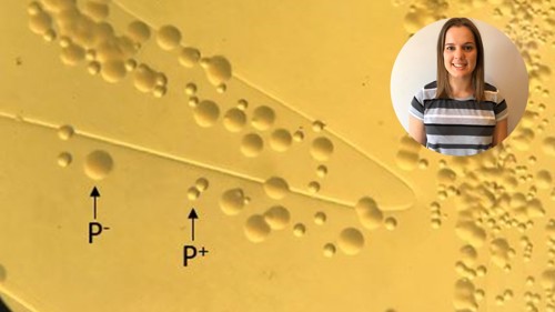 Neisseria gonorrhoeae under the microscope, with labels of the two different morphological states: Non-piliated (P-) and Piliated (P+). Insert: Emma Walker. Images courtesy of Emma Walker.